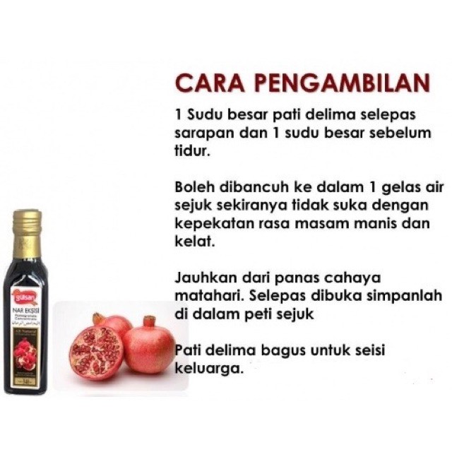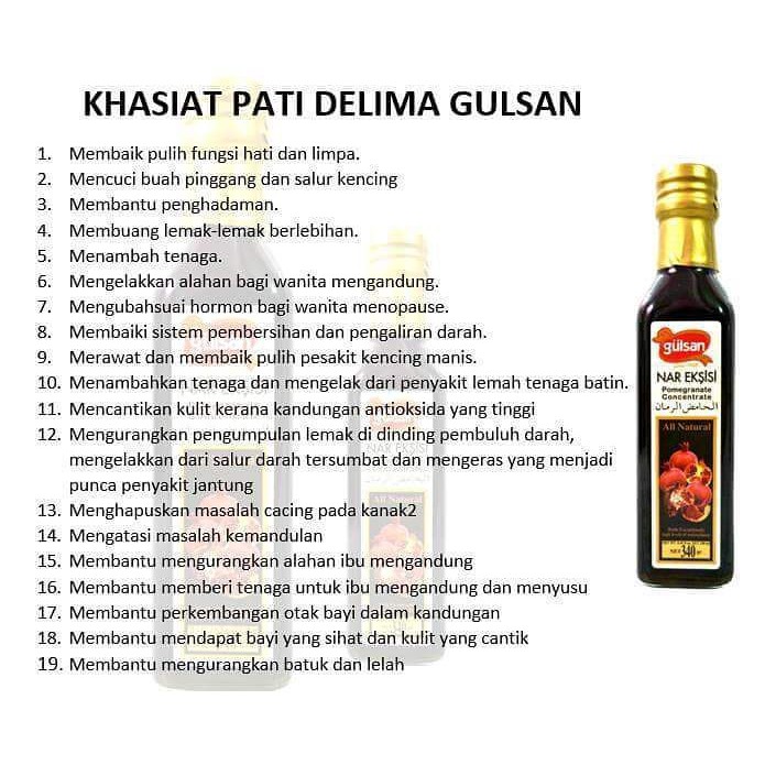 Dalam masa kehamilan ibu hamil harus mendapatkan banyak nutrisi untuk perkembangan janin yang baik. Sebelum sarapan pagi dan sebelum tidur. Cara paling mudah dan murah untuk menjaga kesihatan/kecantikan sekaligus hanya tuang & minum.itu saje rasanya pun sedap !cubalah sebotol dan rasai sendiri khasiat pati delima gulsan from turkeypati jus delima peka. Banyak sekali makanan untuk ibu hamil yang berfungsi efektif untuk menjaga kesehatan selama kehamilan, salah satunya buah delima. Jus pati delima gulsan, kandungan nutrisi buah delima, kelebihan buah delima, khasiat buah delima, manfaat buah delima, pati delima gulsan murah, pati delima untuk ibu mengandung, wanita hamil.
